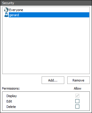 When user gerard is added to the Security box he inherits the Display permission (which is faded out and uneditable) as he is a member of group Everyone: