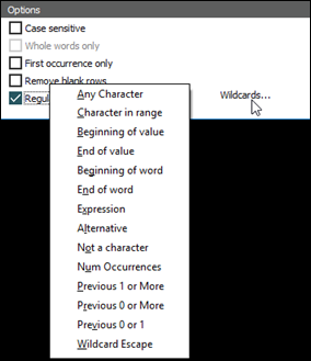 Tip: If you key these wildcard characters into the Text to find field rather than selecting them from the list of wildcards, be sure to select the Regular Expression checkbox (placing a tick in it).