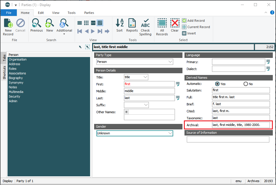 - An Archival: (Derived Names) field in the Parties module, intended to improve cross-matching terminology with other collections.