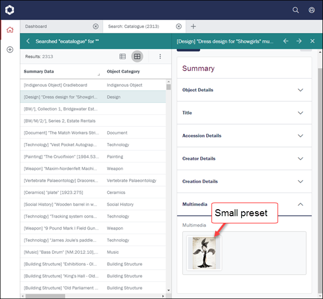 The following example defines a Multimedia Preset for small images displaying in the Axiell Go UI: