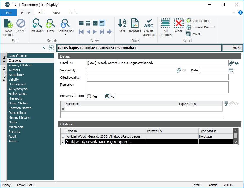To demonstrate, we add two citations about the species Ratus bagus, the first one (All about Ratus bagus by Gerard I. Wood) is the primary citation in which the scientific name (Ratus bagus) was first proposed, the other is a supporting document.