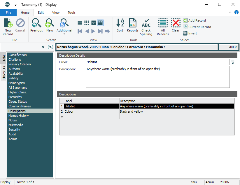 The Descriptions tab is similar to the Notes tab, except that it allows descriptive content to be labelled. The tab comprises one group of fields, Description Details, and a read-only table that lists all added descriptions: