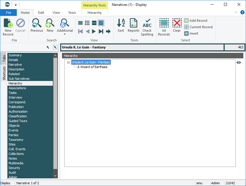 One of the beauties of this approach is that it is possible to view the full tree-like structure of narratives on the Hierarchy tab for any record included in the hierarchy.