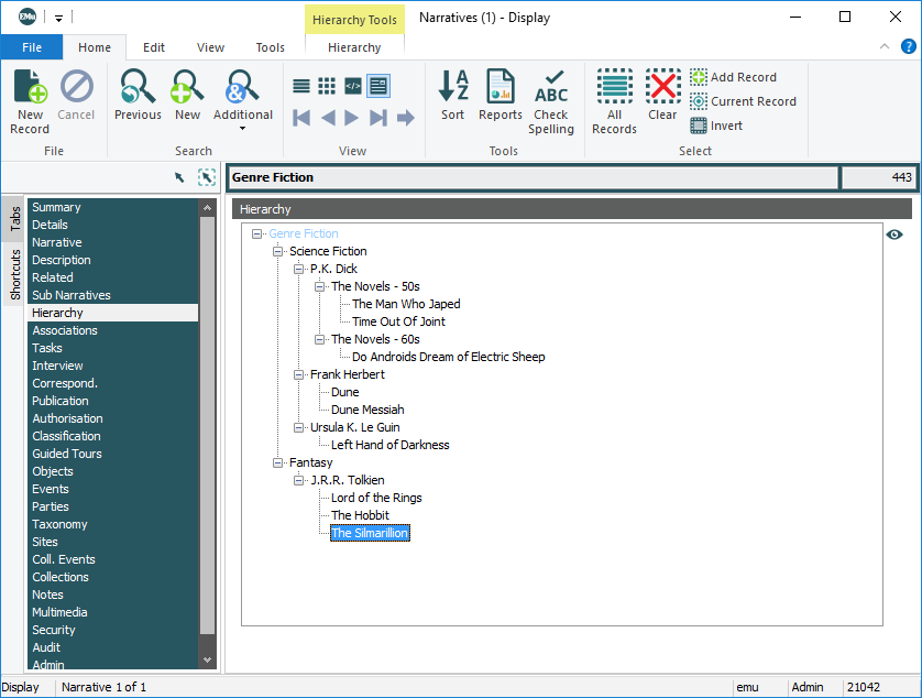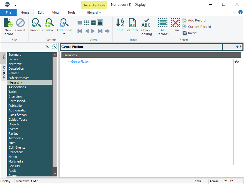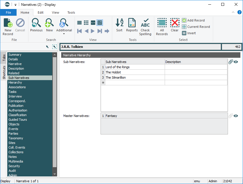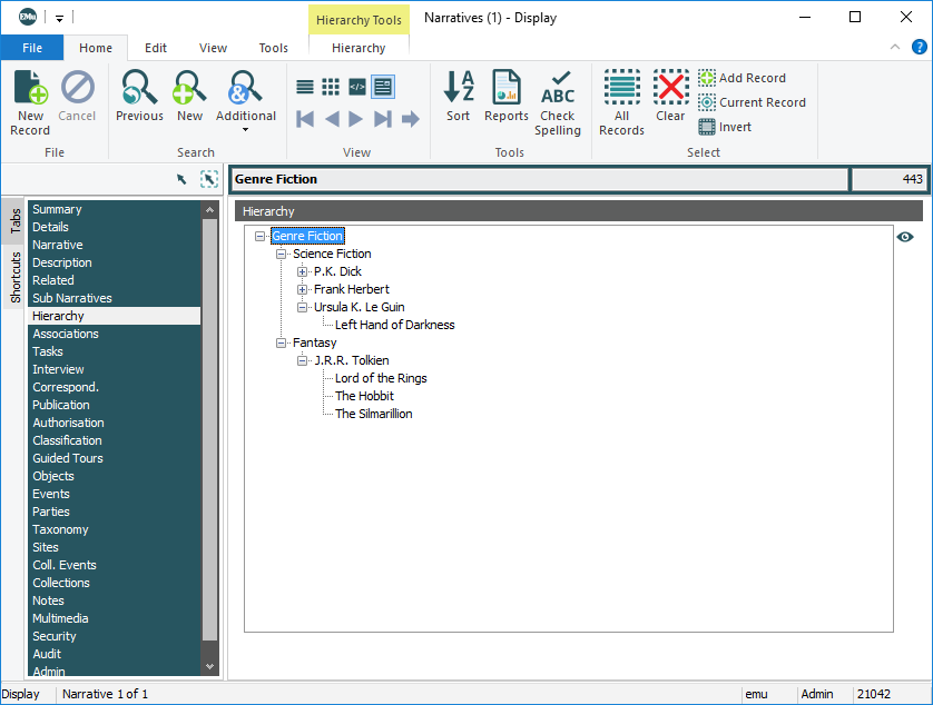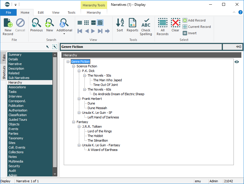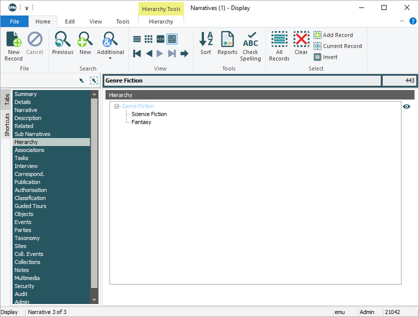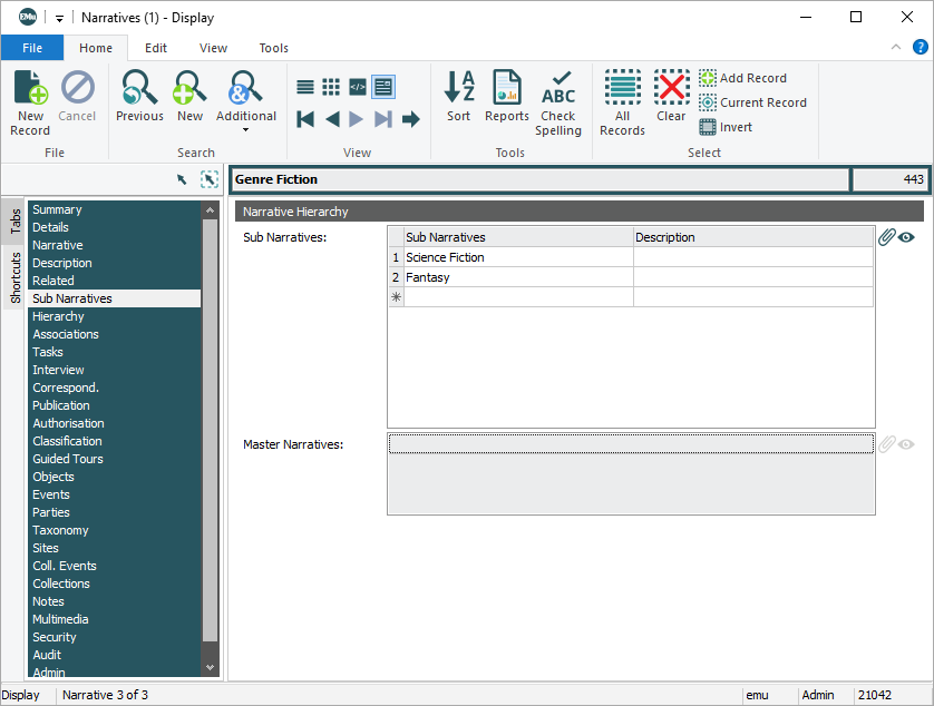 Note: There are several ways to achieve this, the simplest of which is to enter details of a sub narrative, e.g. Science Fiction, in the Sub Narratives: (Narrative Hierarchy) field and press the TAB key. EMu searches the Narratives module using the details entered (see Attachments for more details).
