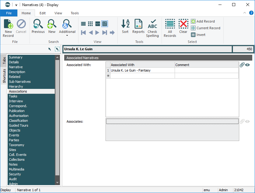 - On the Associations tab of the Ursula K. Le Guin narrative, attach a narrative called Ursula K. Le Guin - Fantasy in the Associated With: (Associated Narratives) table:
