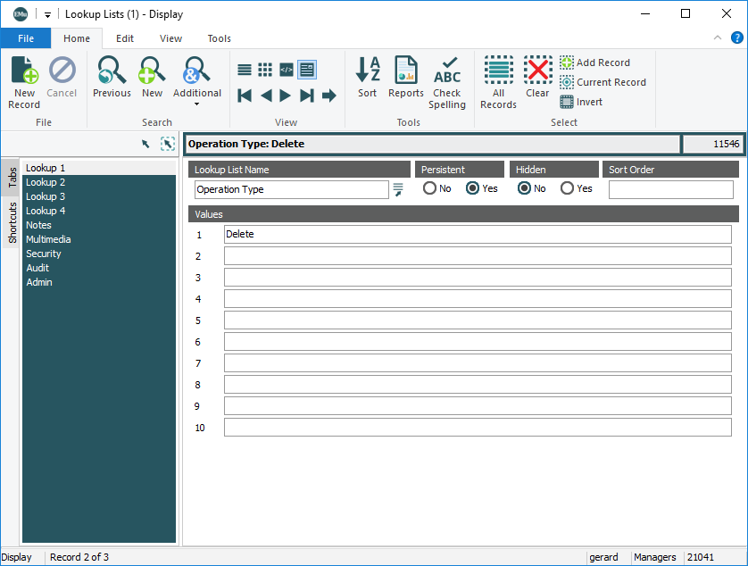 When a new type of Scheduled Operation is added to EMu, a Lookup List entry needs to be added to the Operation Type Lookup List. For the above example a Lookup List record was added to the Operation Type Lookup List with a value of Delete: