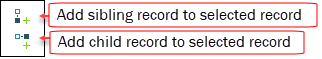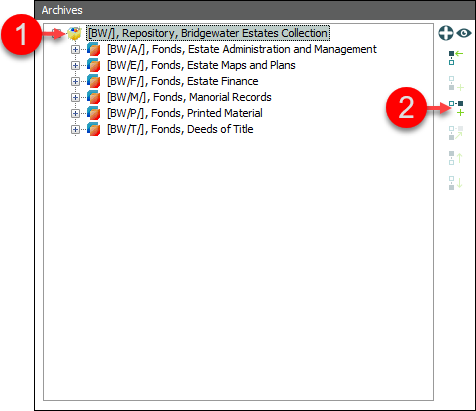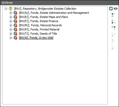 To add a new record as a sibling or a child of a record selected in the hierarchy we use one of two buttons on the Archives tab: