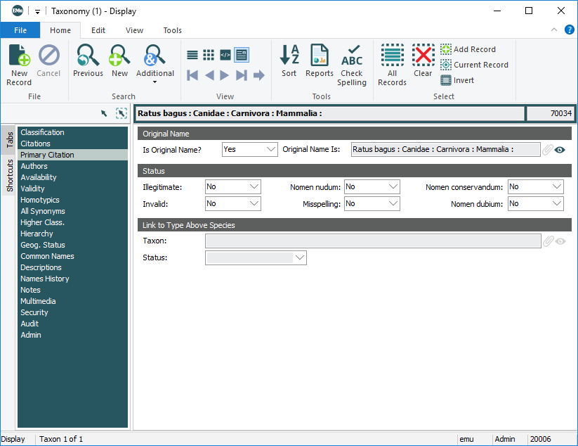 As we see above, when the record is saved the scientific name will display in the Original Name Is: (Original name) field (which is read-only).