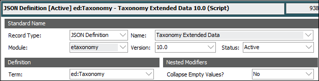The definition name comprises the module name (Command Centre button name) followed by the definition type: Summary Data or Extended Data. The example above shows an Extended Data definition for the Taxonomy module: Taxonomy Extended Data |
