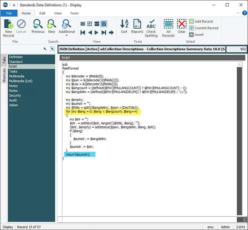 This structure caters for both single language and multi-language systems. The evaluation of the text for the generated string occurs within the for loop. The evaluated string is passed back to EMu through the return statement.