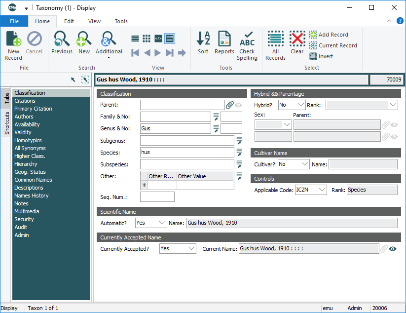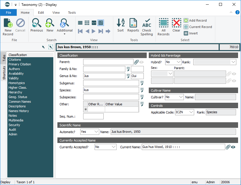 If we now display the Jus kus record, we find that Currently Accepted?: (Currently Accepted Name) is automatically set to No and that Current Name: (Currently Accepted name) points to the Gus hus record: If we check the All Synonyms tab in Gus hus we find that Jus kus is added to the Synonyms List and identified as a Homotypic synonym: Tip: See below for an alternative method to record synonyms. |