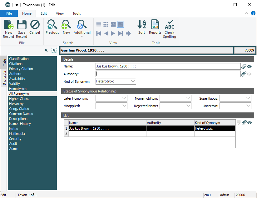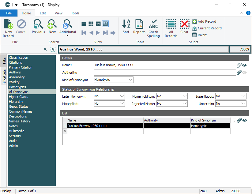 Note: If we were recording a homotypic relationship, we'd select Homotypic from the Kind of Synonym: (Details) Lookup List or we would have added Jus kus Brown, 1950 on the Homotypics tab.