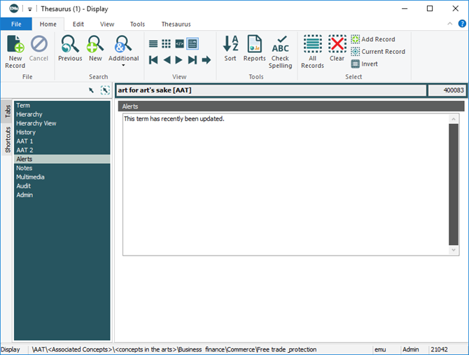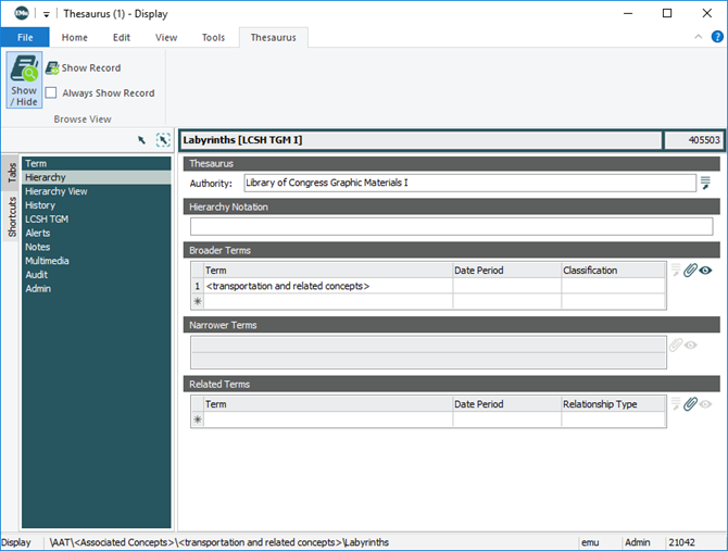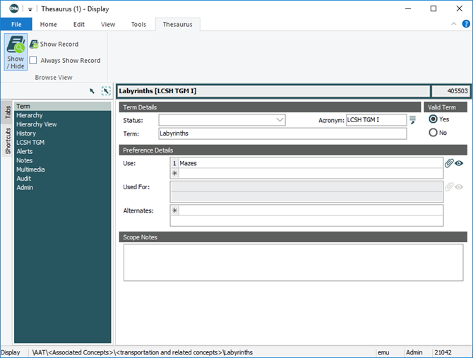 The Thesaurus module has a Browse View that provides a hierarchical view of all loaded thesauri. The Thesaurus module includes a Thesaurus tab in the Ribbon with options when using the Browse View.