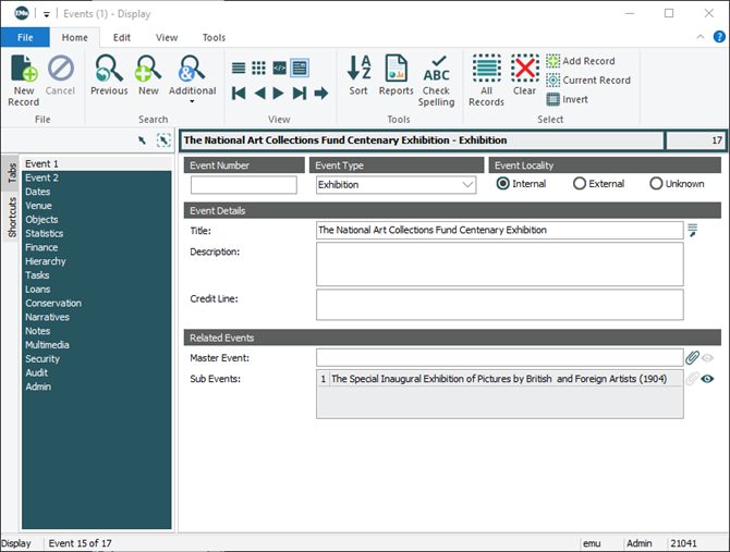 Events modules that use the Exhibition Objects extensions include a Move option on the Events tab of the Ribbon. Objects selected in the Objects Associated With Event table of the Objects tab can be moved to another event; associated Exhibition Objects records are simultaneously updated: