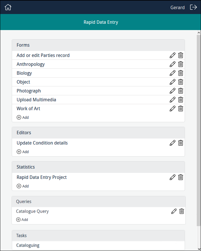 When a Programme Lead accesses a project, any Forms, Editors, Statistics tools and Query pages already created will be listed, along with options to edit, delete and add new instances of them, e.g.: