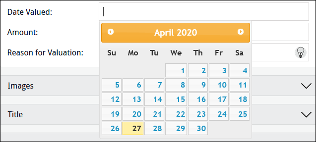 Date fields display a hint indicating the format of dates. When the cursor enters the field, the hint disappears and a calendar pops-up: Either: