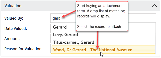 An attachment field allows users to search for and link a record to the current record (the record being created / edited with the Form). For example, Valued by is an attachment field linking to the Parties module. As characters are entered in an attachment field, matching records are dynamically listed. Select the record to attach: |