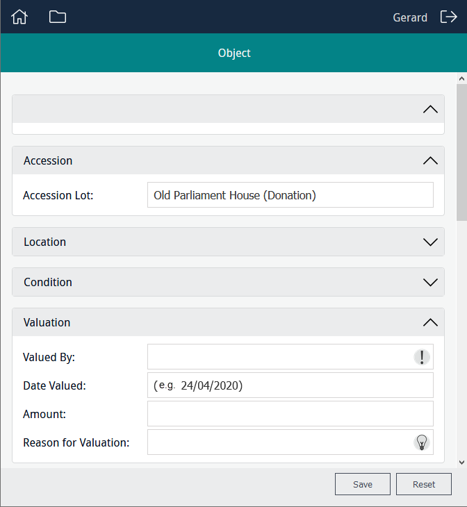 Click the label of the Form you wish to work with, e.g. Object, to display the Form ready for use, for example: