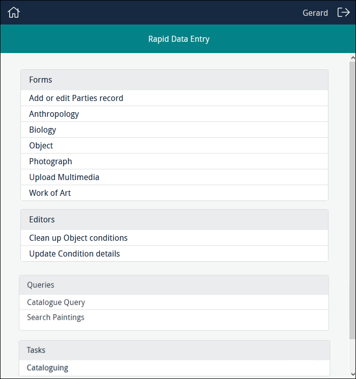 If you have been assigned to one project, or you selected a project from the list of projects assigned to you, a list of Forms, Editors, Queries and Tasks you are authorized to use will display: