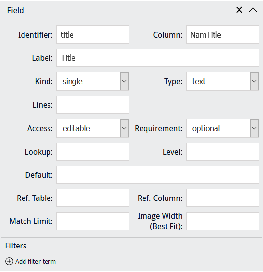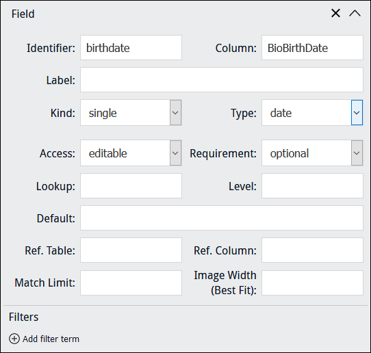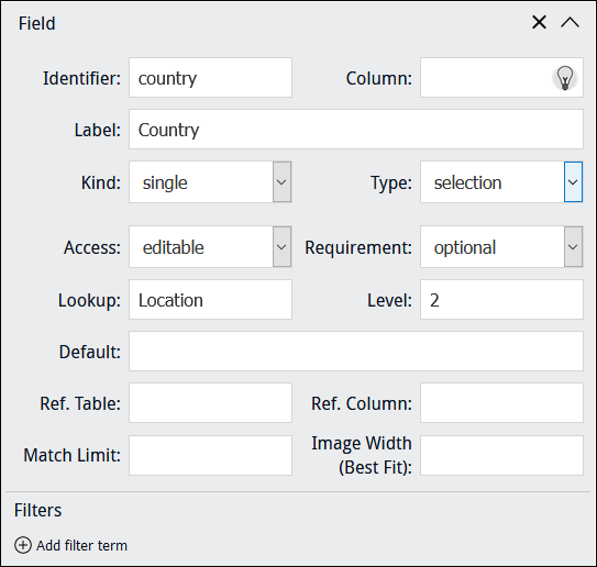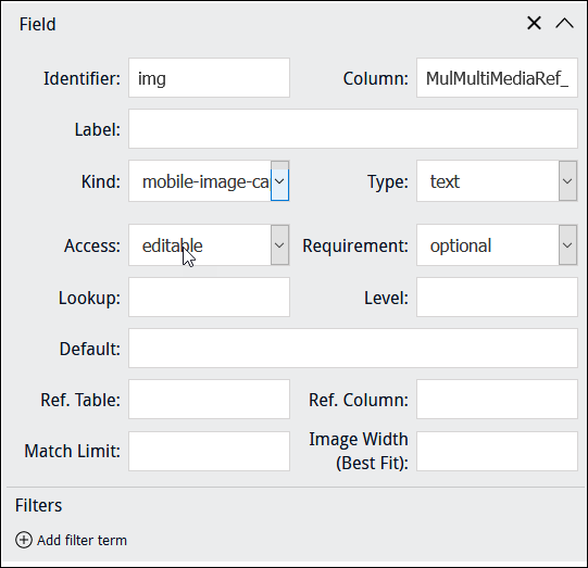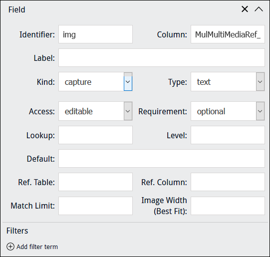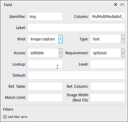 When specifying a Kind of When a Kind of Note: When adding an image control to a Form, it may be better to exclude a Field label in order to maximize the size of the image control. This is particularly important when using a custom layout with columns. In this example, Column points to MulMultiMediaRef_tab, a text field in the Catalogue module which holds details about images used during data capture, including: