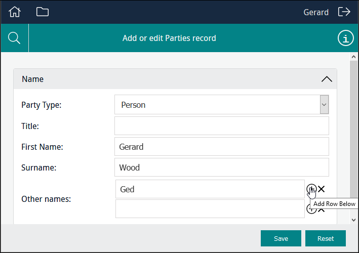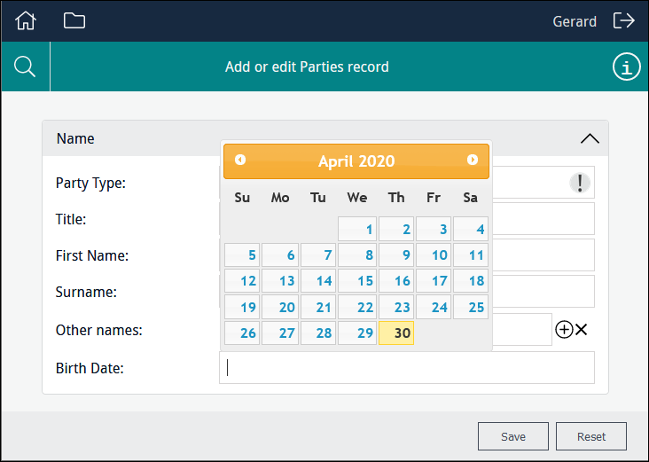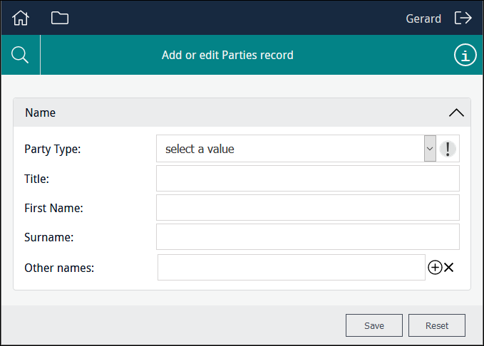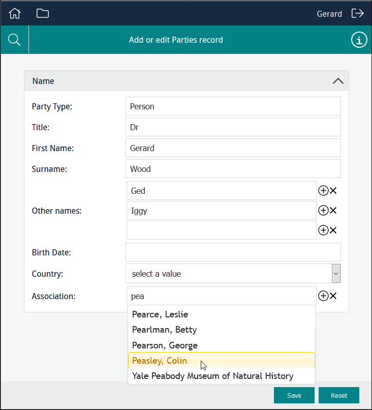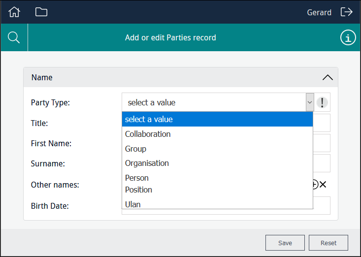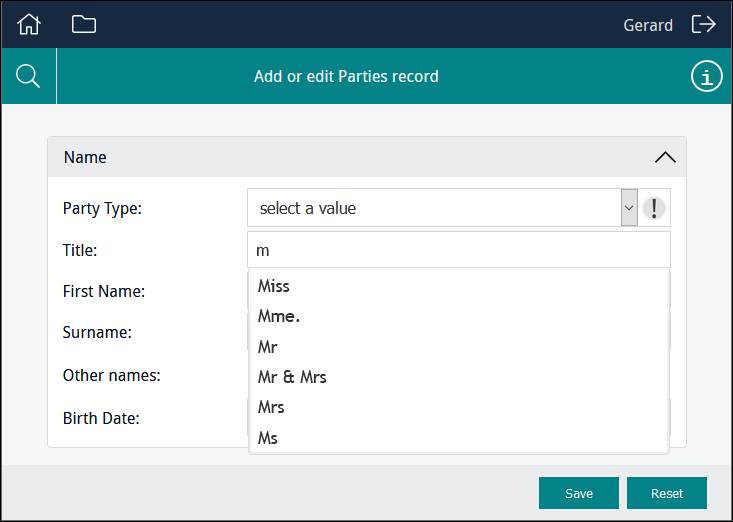 In this example the user is able to select from a read-only list of titles drawn from the NamPartyType column: