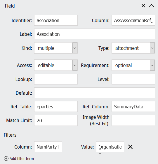 and specify a Column and Value to restrict which records are returned when the user enters characters into the field. In this example, only records where Party Type = Organisation will be listed: