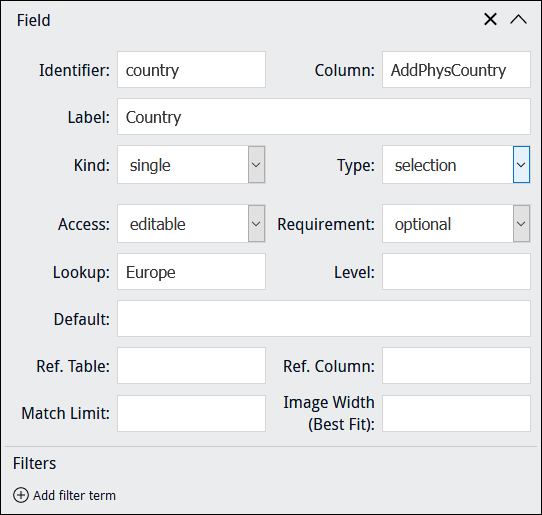 Note: If a Lookup List is large, it might make sense to specify Type: text rather than Type: selection as Type: text filters the list of values presented to users as data is entered in a field, rather than displaying all available values in a drop list.
