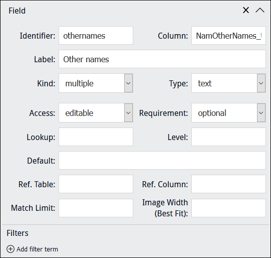 Note: When the back-end name of a table of values is specified in Column, Kind is automatically set to multiple. In the example above, NamOtherNames_tab is the back-end name of the Other Names: (Person Details) field.