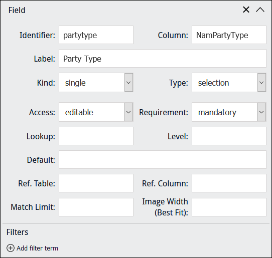 If Column has an associated Lookup List, selecting a Type of selection will present users with a read-only drop list of values drawn from the Lookup List associated with Column. For example, a field such as Party Type in the Parties module, which has the back-end name NamPartyType, has an associated Lookup List called Party Type. In order to display values from the Lookup List associated with Column, it is not necessary to specify the name of the Lookup List in Lookup: