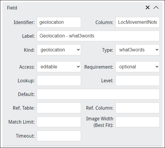 When a Kind of geolocation is specified, Type = what3words by default. As the data generated by a what3words field is text, we would generally point Column at a text field: