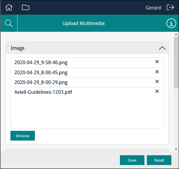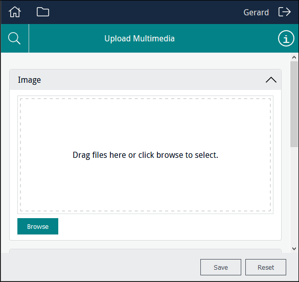 Enable users to locate multimedia of any kind that is accessible to their device and upload it. Note: When specifying a Kind of When a Kind of In this example, Column points to MulMultiMediaRef_tab, a text field in the Catalogue module which holds details about multimedia uploaded during data entry: Users can drag one or more files onto the control or click Browse to navigate to a file and add it to the control: A file can be removed from the list by clicking Note: The When the Form is saved, a record will be created in the Multimedia module for each of the uploaded files. When using a Form to create or edit a record, in the Catalogue module for instance, the newly created Multimedia records will be attached to the current record. If the Form allows users to search a module for existing records, any multimedia already attached to the record will be listed: Note: A multimedia resource listed in the Clicking |