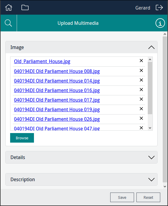 You typically build forms that allow users to add or edit records in modules such as the Catalogue or Parties. On these forms you can include Multimedia fields and users will be able to add or remove attachments to Multimedia records. Note that this does not allow users to delete records from the Multimedia module. When users upload multimedia when editing Catalogue records, for example, this will create a record in the Multimedia module for the uploaded resource and attach that record to the record they are editing. A Form would need to be designed specifically for the purpose of editing records in the Multimedia module in order to alter Multimedia records themselves.