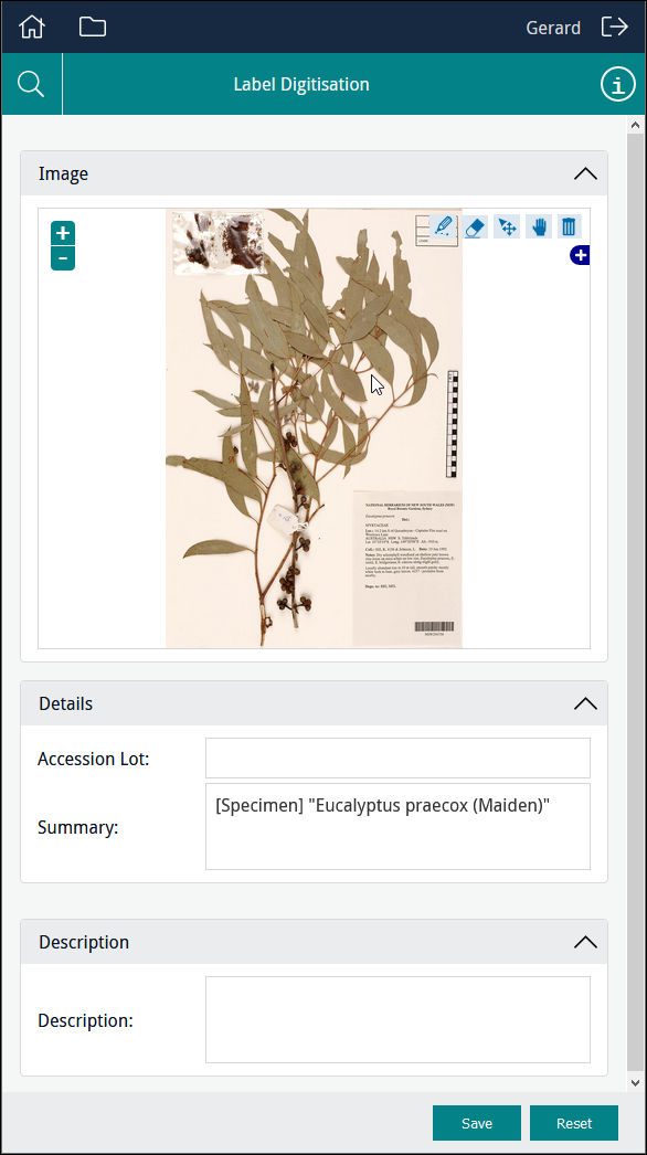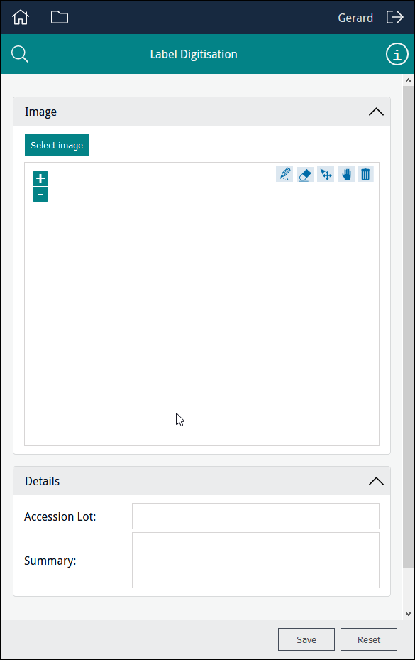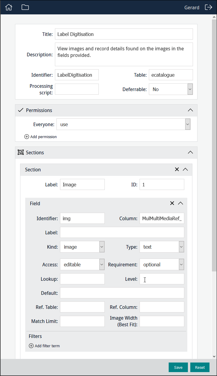 The field which holds details about images used during data capture is populated with these details when an image is uploaded using Sapphire. See Kind: image-capture for details. Note: The field can also be populated with details about images using various back-end scripts. Having added an image to the Form, we could then add fields necessary to record any details available on the image: |