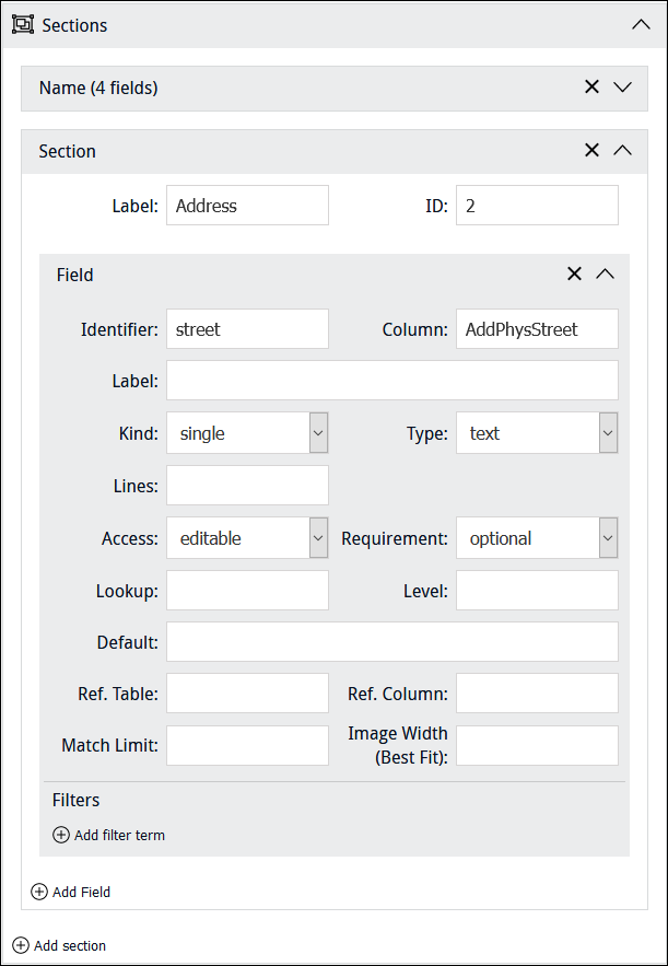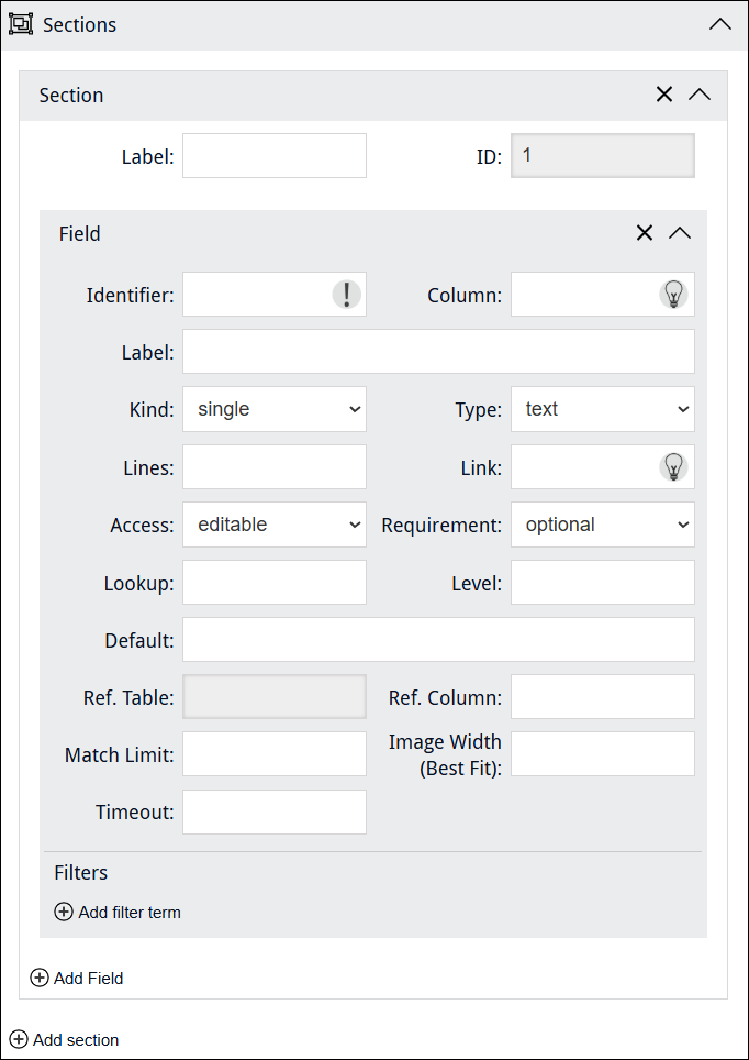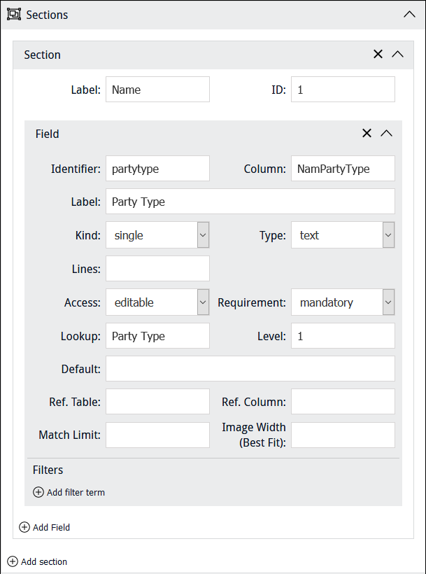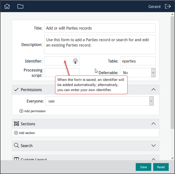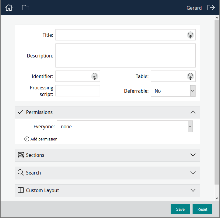 Here you configure a Form, add elements to it, and assign permissions to users (specify who can use this specific Form; who can modify it).
