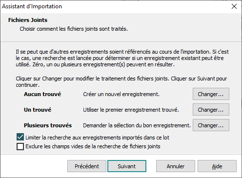Spécifiez que l'option Limiter la recherche aux enregistrements importés dans ce lot à l'écran Fichiers joints de l'Assistant d'Importation est cochée / décochée par défaut.