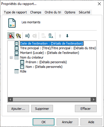Chaque fois que nous concevons un rapport pour une application tierce telle que Crystal Reports, Microsoft Word et Excel, la première étape a toujours lieu dans EMu où nous nommons le rapport et sélectionnons les champs à inclure dans celui-ci. Nous pouvons également trier et grouper les champs si nécessaire, et spécifier qui est en mesure de l'exécuter.