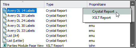 Une boîte Rapport comprend une liste de rapports prédéfinis. La liste inclut le nom du rapport, son type et le nom du propriétaire du rapport (qui l’a créée).