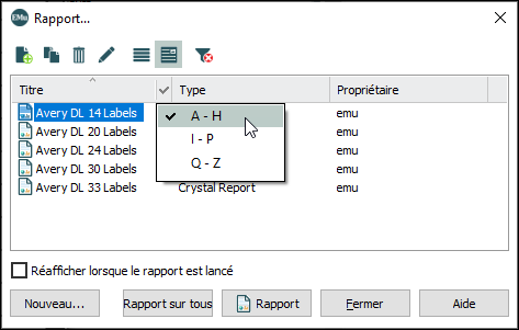 Il est possible d’accéder à la boîte de dialogue Rapports en sélectionnant Rapports à l’onglet Accueil du ruban d’un module :