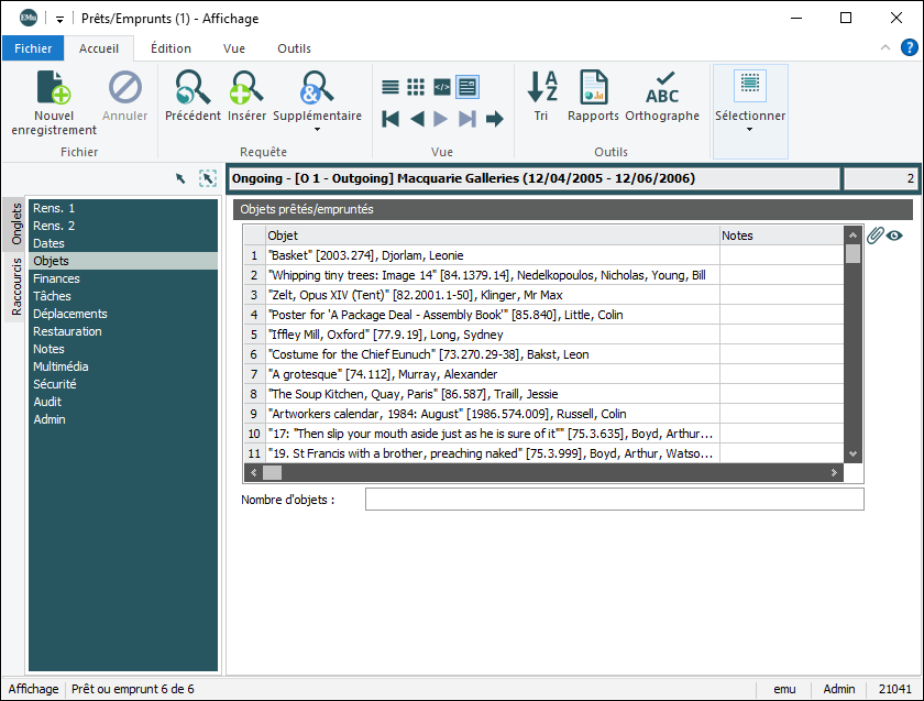 Ainsi ObjObjectsLoanedRef_tab(1).TitAccessionNo :