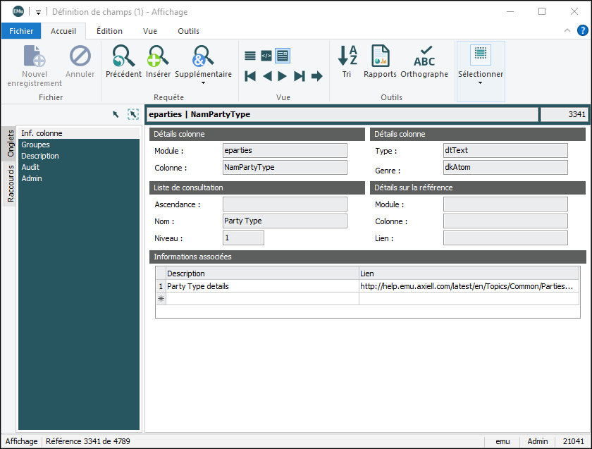 - Le nom back-end du module dans lequel le champ s'affiche (nécessaire lors de la création de rapports, de Vues de Listes et de Tri par exemple : NamPartyType)