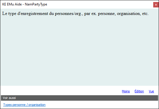 L'Aide au niveau du champ pour Type personne/organisation révèle que :