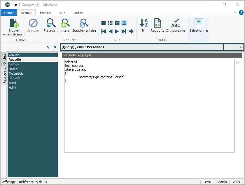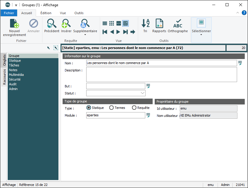 Grâce aux commandes Groupes de l'onglet Outils du ruban (accessible depuis la plupart des modules), les utilisateurs peuvent attribuer un nom à un groupe d'enregistrements et retrouver ensuite ce groupe. Il est également possible d'ajouter des enregistrements à un groupe, pour assembler un ensemble complexe d'enregistrements au fil du temps.