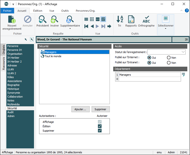 Par exemple, une institution décide que si tout le monde doit pouvoir consulter tous les enregistrements dans le module Personnes / Organisations, seuls les gérants (Managers) doivent être autorisés à modifier et à supprimer les enregistrements concernant le personnel. Nous devons nous assurer que :