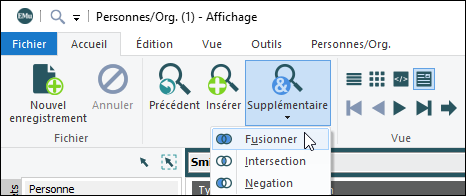 2. Sélectionner Supplémentaire dans l'onglet Accueil du ruban et sélectionner une des options de relation : Fusionner, Intersection, Négation.