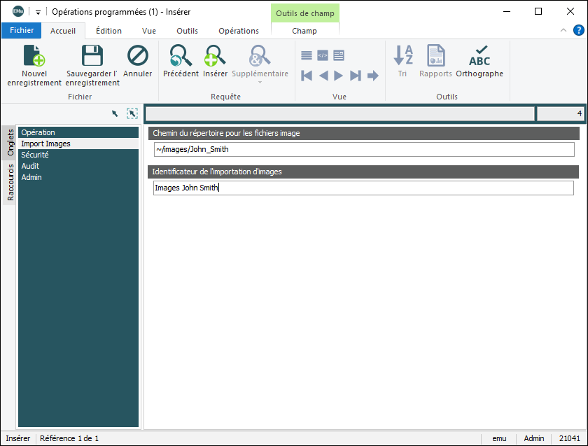 ~/../..ou../.. - Si nécessaire, saisissez un identificateur dans le champ Identificateur de l’importation d’images. La valeur saisie ici sera stockée dans le champ Identificateur de l’importation de l’onglet Admin de tous les enregistrements Multimédia créés par cette importation planifiée :