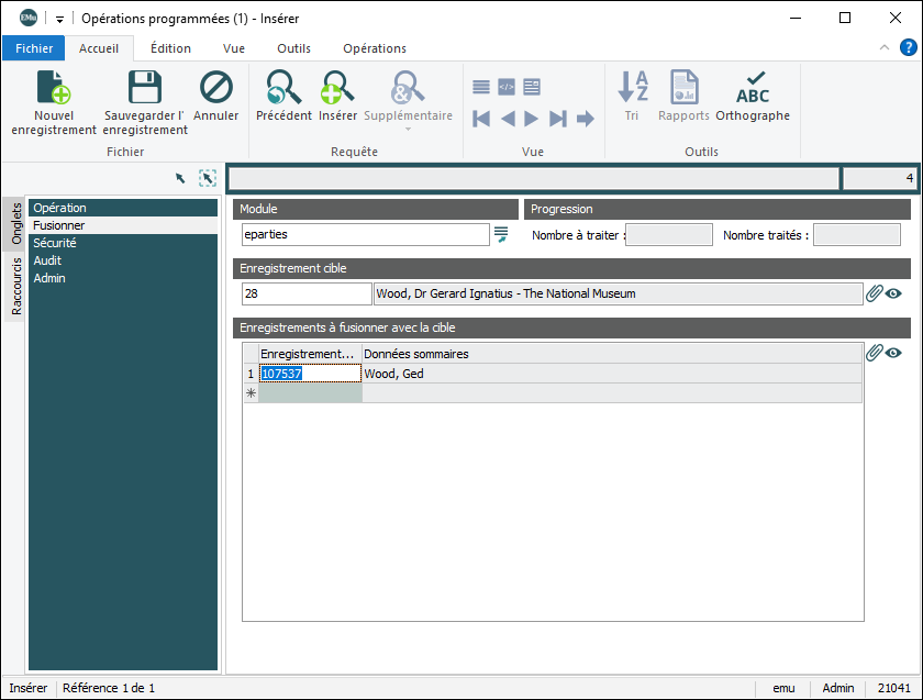 Si aucun module n’a été sélectionné dans l’onglet Opération, indiquez dans le champ Module le module dans lequel la fusion aura lieu.