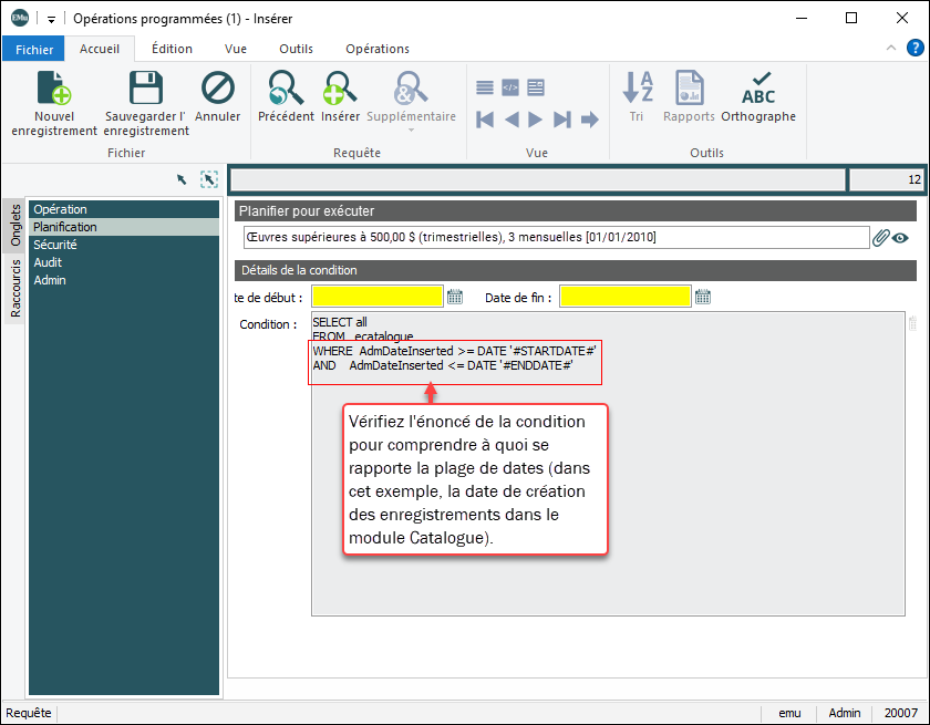 emuoperationsest le script utilisé pour exécuter une opération programmée dans un enregistrement du module Opérations programmées. Lorsque emuoperations s’exécute, il recherche les opérations qui étaient planifiées pour être exécutées avant la date et heure actuelles et les lance. Ainsi, si emuoperations est planifié pour s’exécuter une fois par jour, il commencera toute opération programmée pour s’exécuter dans les 24 heures précédentes : en théorie, une opération pourrait avoir été planifiée pour s’exécuter 23 heures et 59 minutes plus tôt. Si emuoperations doit être exécuté une fois par jour, il est probablement judicieux de programmer des opérations proches de l’heure d’exécution de emuoperations. Il est également possible d’exécuter emuoperations à différents moments de la journée. - Dans Personne avisée : (Notification de fin) joignez l’enregistrement Personnes / Organisations pour toute personne qui doit être notifiée par e-mail lorsque l’opération programmée est terminée.