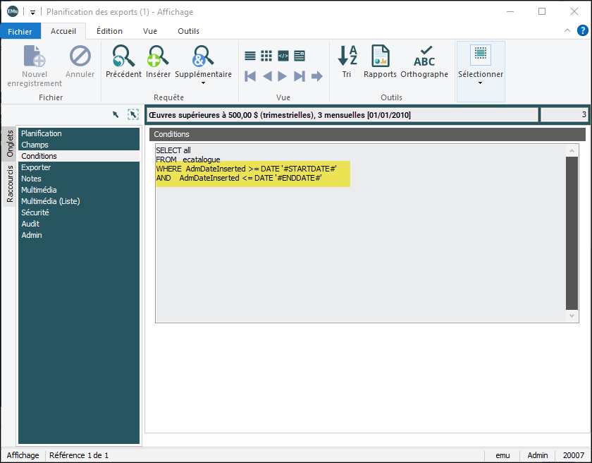 #STARTDATE#et#ENDDATE#). Les conditions d’exportation peuvent être consultées dans l’onglet Conditions du module Opérations programmées :Conseil : Des détails sur la spécification des plages de dates lors de la définition d’une exportation planifiée sont disponibles ici.