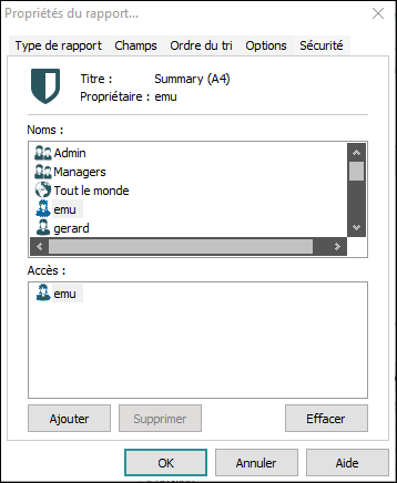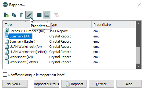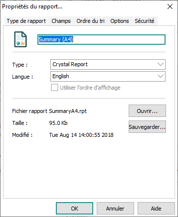 De nombreux éléments, tels que les rapports, les exports, les groupes, les tris, les modèles d'enregistrement, etc. sont spécifiés dans une fenêtre Propriétés.