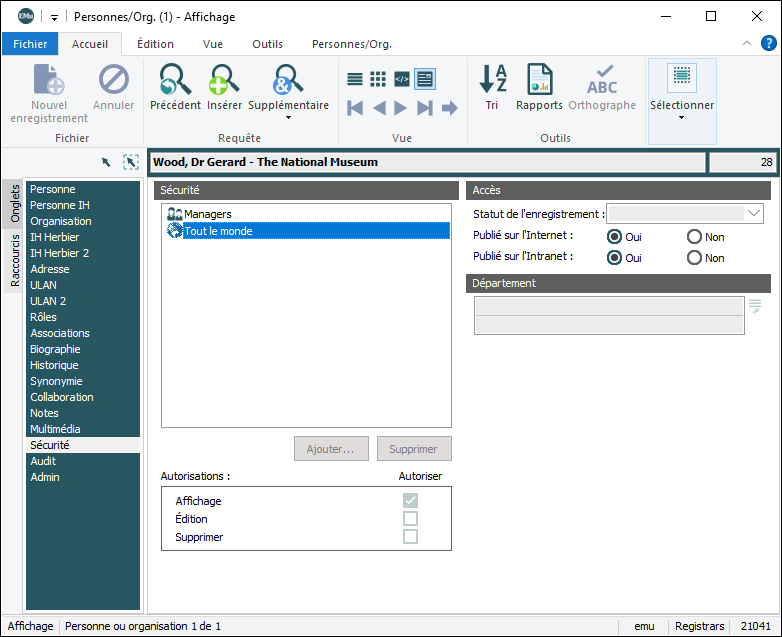 Il est également possible de rechercher des enregistrements en fonction des autorisations de sécurité au niveau Enregistrement attribuées aux utilisateurs et aux groupes. Si un utilisateur ou groupe a été retiré d'EMu, il est toujours possible avec les champs Sécurité (Directe) de localiser les enregistrements pour lesquels il avait reçu des autorisations.